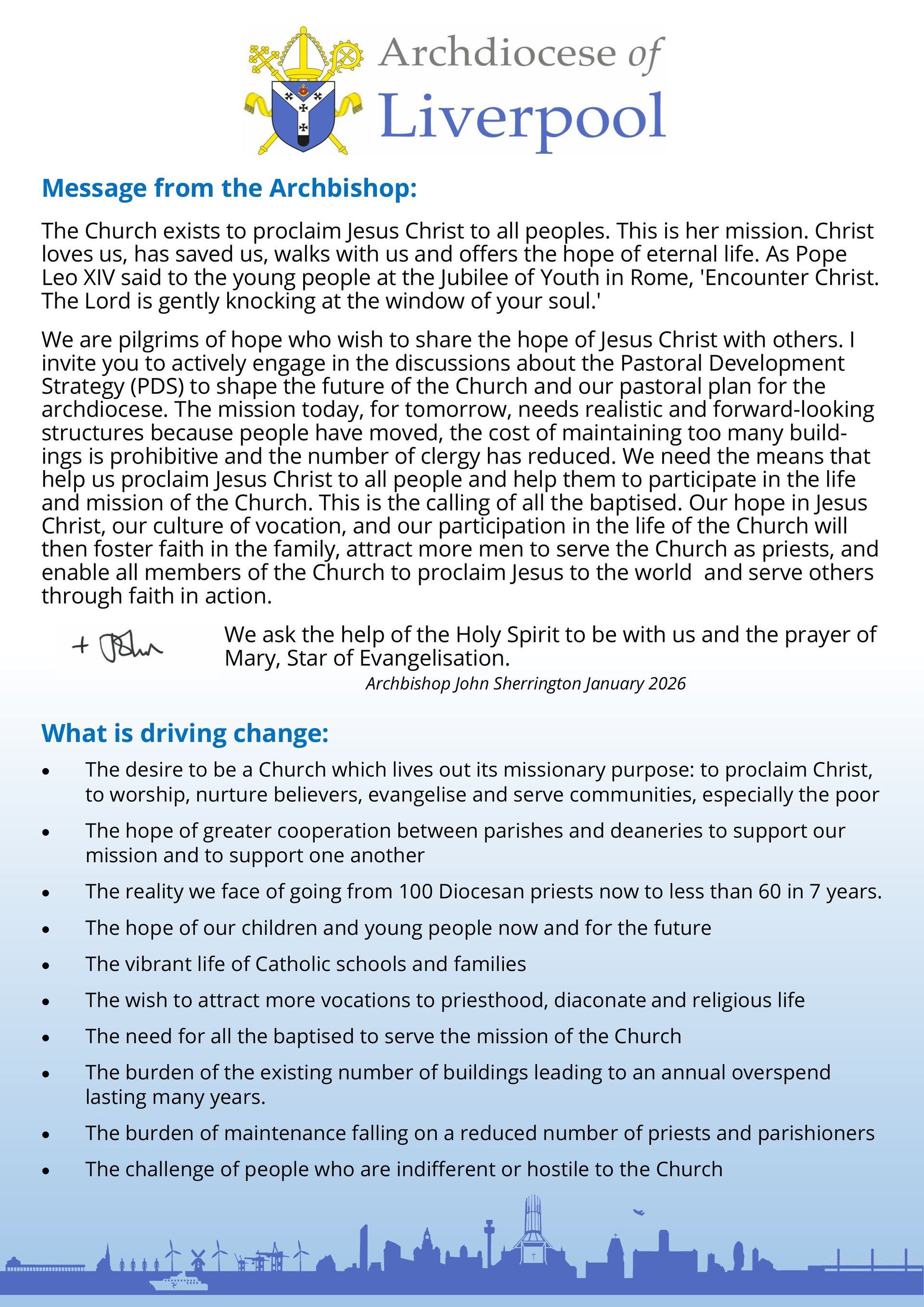 There are no immediate plans to form a single new parish from St John Vianney and St Mary’s. We need to focus on the longer-term challenges facing the Catholic community in England and Wales. Over the coming years, it will become increasingly difficult to sustain the current pattern of parishes across the Archdiocese. This is for three key reasons: